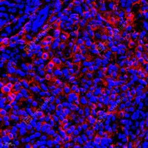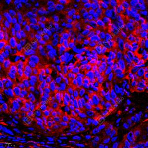 IF检测CRMP3蛋白(货号 GB112592)(红色). 样品: 人喉癌, 4%多聚甲醛 (货号G1101) 固定12-24小时. 抗原修复: Tris-EDTA抗原修复液(pH 9.0) (G1203), 98℃, 20分钟. 封闭: 3% BSA(货号GC305010)的PBS溶液, 室温孵育30分钟. —抗: 1: 650稀释, 4℃ 孵育过夜. 二抗: Cy3标记山羊抗兔IgG (H+L) (货号GB21303), 1: 300稀释, 室温孵育1小时. |
