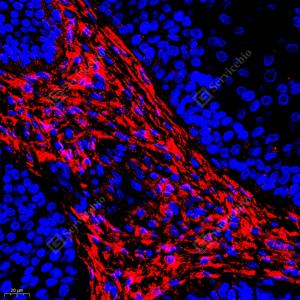 IF检测CRMP3蛋白(货号 GB112592)(红色). 样品: 小鼠卵巢, 4%多聚甲醛 (货号G1101) 固定12-24小时. 抗原修复: Tris-EDTA抗原修复液(pH 9.0) (G1203), 98℃, 20分钟. 封闭: 3% BSA(货号GC305010)的PBS溶液, 室温孵育30分钟. —抗: 1: 650稀释, 4℃ 孵育过夜. 二抗: Cy3标记山羊抗兔IgG (H+L) (货号GB21303), 1: 300稀释, 室温孵育1小时. |
