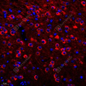 IF检测CRMP3蛋白(货号 GB112592)(红色). 样品: 小鼠脑, 4%多聚甲醛 (货号G1101) 固定12-24小时. 抗原修复: Tris-EDTA抗原修复液(pH 9.0) (G1203), 98℃, 20分钟. 封闭: 3% BSA(货号GC305010)的PBS溶液, 室温孵育30分钟. —抗: 1: 650稀释, 4℃ 孵育过夜. 二抗: Cy3标记山羊抗兔IgG (H+L) (货号GB21303), 1: 300稀释, 室温孵育1小时. |
