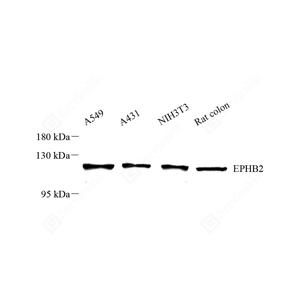 WB检测Eph receptor B2蛋白(货号 GB112986). 样品: 经RIPA裂解液(货号G2002)处理的蛋白质. 封闭: 封闭: 3%脱脂牛奶(货号GC310001)溶于TBST溶液, 室温孵育1小时. —抗: 1: 1000稀释, 4℃ 孵育过夜. 二抗: HRP标记山羊抗兔IgG (H+L) (货号GB23303), 1: 5000稀释, 室温孵育1小时. |