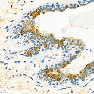 IHC检测Ephrin A4蛋白(货号 GB111899). 样品: 人乳腺癌, 4%多聚甲醛 (货号G1101) 固定12-24小时. 抗原修复: 柠檬酸抗原修复液(干粉, pH 6.0) (G1201), 98℃, 20分钟. —抗: 1: 2000稀释, 4℃ 孵育过夜. 二抗: HRP标记山羊抗兔IgG (H+L) (货号GB23303), 1: 200稀释, 室温孵育1小时. |