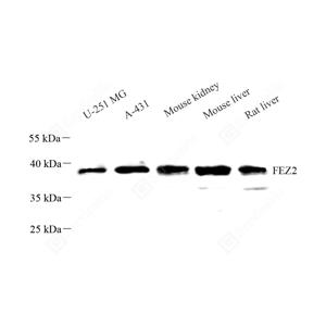WB检测FEZ2蛋白(货号 GB114178). 样品: 经RIPA裂解液(货号G2002)处理的蛋白质. 封闭: 封闭: 3%脱脂牛奶(货号GC310001)溶于TBST溶液, 室温孵育1小时. —抗: 1: 1000稀释, 4℃ 孵育过夜. 二抗: HRP标记山羊抗兔IgG (H+L) (货号GB23303), 1: 5000稀释, 室温孵育1小时. |