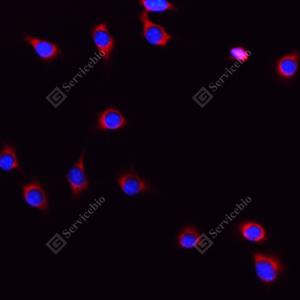 ICC检测NENF蛋白(货号 GB114996)(红色). 样品: NIH-3T3细胞, 4%多聚甲醛 (货号G1101) 固定20分钟. 封闭: 3% BSA(货号GC305010)的PBS溶液, 室温孵育30分钟. —抗: 1: 100稀释, 4℃ 孵育过夜. 二抗: Cy3标记山羊抗兔IgG (H+L) (货号GB21303), 1: 300稀释, 室温孵育1小时. |