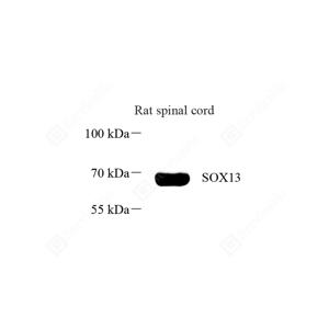 WB检测SOX13蛋白(货号 GB114391). 样品: 经RIPA裂解液(货号G2002)处理的蛋白质. 封闭: 封闭: 3%脱脂牛奶(货号GC310001)溶于TBST溶液, 室温孵育1小时. —抗: 1: 500稀释, 4℃ 孵育过夜. 二抗: HRP标记山羊抗兔IgG (H+L) (货号GB23303), 1: 5000稀释, 室温孵育1小时. |
