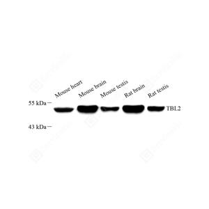 WB检测TBL2蛋白(货号 GB113048). 样品: 经RIPA裂解液(货号G2002)处理的蛋白质. 封闭: 封闭: 3%脱脂牛奶(货号GC310001)溶于TBST溶液, 室温孵育1小时. —抗: 1: 1000稀释, 4℃ 孵育过夜. 二抗: HRP标记山羊抗兔IgG (H+L) (货号GB23303), 1: 5000稀释, 室温孵育1小时. |