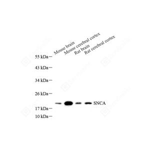 WB检测Alpha-synuclein蛋白(货号 GB11404). 样品: 经RIPA裂解液(货号G2002)处理的蛋白质. 封闭: 3%脱脂牛奶(货号GC310001)溶于TBST溶液, 室温孵育1小时. —抗: 1: 300稀释, 4℃ 孵育过夜. 二抗: HRP标记山羊抗兔IgG (H+L) (货号GB23303), 1: 5000稀释, 室温孵育1小时. |