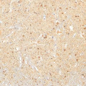IHC检测Alpha-synuclein蛋白(货号 GB11773). 样品: 人少突胶质细胞瘤, 4%多聚甲醛 (货号G1101) 固定12-24小时. 抗原修复: 柠檬酸抗原修复液(干粉, pH 6.0) (G1201), 98℃, 20分钟. —抗: 1: 1000稀释, 4℃ 孵育过夜. 二抗: HRP标记山羊抗兔IgG (H+L) (货号GB23303), 1: 200稀释, 室温孵育1小时. |