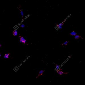 ICC检测Alpha-synuclein蛋白(货号 GB11773)(红色). 样品: SHSY5Y细胞, 4%多聚甲醛 (货号G1101) 固定20分钟. 封闭: 3% BSA(货号GC305010)的PBS溶液, 室温孵育30分钟. 一抗: 1: 800稀释, 4℃ 孵育过夜. 二抗: Cy3标记山羊抗兔IgG (H+L) (货号GB21303), 1: 300稀释, 室温孵育1小时. |