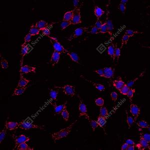 | ICC检测Alpha-synuclein蛋白(货号 GB112945)(红色). 样品: SHSY5Y细胞, 4%多聚甲醛 (货号G1101) 固定20分钟. 封闭: 3% BSA(货号GC305010)的PBS溶液, 室温孵育30分钟. 一抗: 1: 1400稀释, 4℃ 孵育过夜. 二抗: Cy3标记山羊抗兔IgG (H+L) (货号GB21303), 1: 300稀释, 室温孵育1小时. |