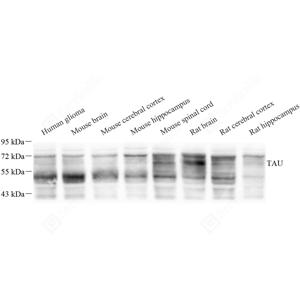 WB检测Tau蛋白(货号 GB111608). 样品: 经RIPA裂解液(货号G2002)处理的蛋白质. 封闭: 3%脱脂牛奶(货号GC310001)溶于TBST溶液, 室温孵育1小时. —抗: 1: 2000稀释, 4℃ 孵育过夜. 二抗: HRP标记山羊抗兔IgG (H+L) (货号GB23303), 1: 5000稀释, 室温孵育1小时. |