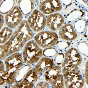 | IHC检测Ferritin Heavy Chain蛋白(货号 GB115535). 样品: 人肾, 4%多聚甲醛 (货号G1101) 固定12-24小时. 抗原修复: Tris-EDTA抗原修复液(pH 9.0) (G1203), 98℃, 20分钟. —抗: 1: 200稀释, 4℃ 孵育过夜. 二抗: HRP标记山羊抗兔IgG (H+L) (货号GB23303), 1: 200稀释, 室温孵育1小时. |