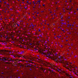 IF检测Tau蛋白(货号 GB151608)(红色). 样品: 小鼠脑, 4%多聚甲醛 (货号G1101) 固定12-24小时. 抗原修复: Tris-EDTA抗原修复液(pH 9.0) (G1203), 98℃, 20分钟. 封闭: 3% BSA(货号GC305010)的PBS溶液, 室温孵育30分钟. —抗: 1: 900稀释, 4℃ 孵育过夜. 二抗: Cy3标记山羊抗小鼠IgG (H+L) (货号GB21301), 1: 300稀释, 室温孵育1小时. |