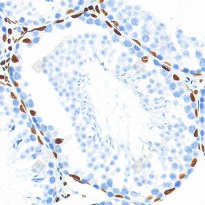 IHC检测Androgen receptor蛋白(货号 GB155311). 样品: 猴睾丸, 4%多聚甲醛 (货号G1101) 固定12-24小时. 抗原修复: 柠檬酸抗原修复液(干粉, pH 6.0) (G1201), 高压锅均匀喷气计时2分钟. —抗: 1: 1500稀释, 4℃ 孵育过夜. 二抗: S-vision免疫组化多聚二抗(山羊抗兔),即用型 (货号G1302), 室温孵育20分钟. |