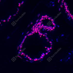 IF检测Androgen receptor蛋白(货号 GB155311)(红色). 样品: 小鼠前列腺, 4%多聚甲醛 (货号G1101) 固定12-24小时. 抗原修复: 柠檬酸抗原修复液(干粉, pH 6.0) (G1201), 高压锅均匀喷气计时2分钟. 封闭: 3% BSA(货号GC305010)的PBS溶液, 室温孵育30分钟. —抗: 1: 1500稀释, 4℃ 孵育过夜. 二抗: Cy3标记山羊抗兔IgG (H+L) (货号GB21303), 1: 300稀释, 室温孵育1小时. |