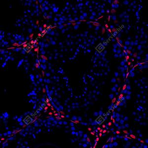 IF检测Androgen receptor蛋白(货号 GB155311)(红色). 样品: 大鼠睾丸, 4%多聚甲醛 (货号G1101) 固定12-24小时. 抗原修复: 柠檬酸抗原修复液(干粉, pH 6.0) (G1201), 高压锅均匀喷气计时2分钟. 封闭: 3% BSA(货号GC305010)的PBS溶液, 室温孵育30分钟. —抗: 1: 1500稀释, 4℃ 孵育过夜. 二抗: Cy3标记山羊抗兔IgG (H+L) (货号GB21303), 1: 300稀释, 室温孵育1小时. |