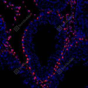 IF检测Androgen receptor蛋白(货号 GB155311)(红色). 样品: 猴睾丸, 4%多聚甲醛 (货号G1101) 固定12-24小时. 抗原修复: 柠檬酸抗原修复液(干粉, pH 6.0) (G1201), 高压锅均匀喷气计时2分钟. 封闭: 3% BSA(货号GC305010)的PBS溶液, 室温孵育30分钟. —抗: 1: 1500稀释, 4℃ 孵育过夜. 二抗: Cy3标记山羊抗兔IgG (H+L) (货号GB21303), 1: 300稀释, 室温孵育1小时. |