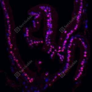 IF检测Androgen receptor蛋白(货号 GB155311)(红色). 样品: 大鼠前列腺, 4%多聚甲醛 (货号G1101) 固定12-24小时. 抗原修复: 柠檬酸抗原修复液(干粉, pH 6.0) (G1201), 高压锅均匀喷气计时2分钟. 封闭: 3% BSA(货号GC305010)的PBS溶液, 室温孵育30分钟. —抗: 1: 3000稀释, 4℃ 孵育过夜. 二抗: Cy3标记山羊抗兔IgG (H+L) (货号GB21303), 1: 300稀释, 室温孵育1小时. |