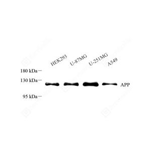 | WB检测Amyloid beta precursor protein蛋白(货号 GB11307). 样品: 经RIPA裂解液(货号G2002)处理的蛋白质. 封闭: 3%脱脂牛奶(货号GC310001)溶于TBST溶液, 室温孵育1小时. —抗: 1: 800稀释, 4℃ 孵育过夜. 二抗: HRP标记山羊抗兔IgG (H+L) (货号GB23303), 1: 5000稀释, 室温孵育1小时. |