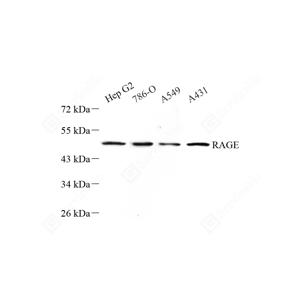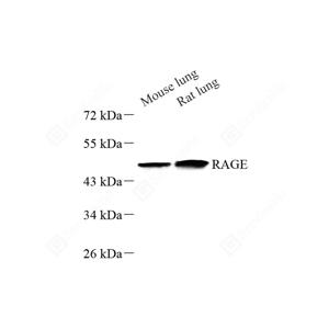 WB检测RAGE蛋白(货号 GB11278). 样品: 经RIPA裂解液(货号G2002)处理的蛋白质. 封闭: 封闭: 3%脱脂牛奶(货号GC310001)溶于TBST溶液, 室温孵育1小时. —抗: 1: 500稀释, 4℃ 孵育过夜. 二抗: HRP标记山羊抗兔IgG (H+L) (货号GB23303), 1: 5000稀释, 室温孵育1小时. |