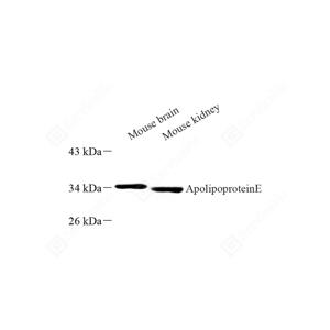 WB检测Apolipoprotein E蛋白(货号 GB112288). 样品: 经RIPA裂解液(货号G2002)处理的蛋白质. 封闭: 3%脱脂牛奶(货号GC310001)溶于TBST溶液, 室温孵育1小时. —抗: 1: 500稀释, 4℃ 孵育过夜. 二抗: HRP标记山羊抗兔IgG (H+L) (货号GB23303), 1: 5000稀释, 室温孵育1小时. |