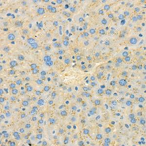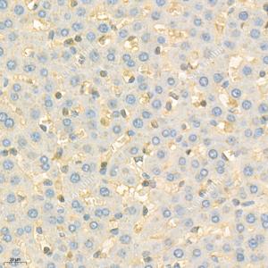 IHC检测Apolipoprotein E蛋白(货号 GB112288). 样品: 小鼠肝, 4%多聚甲醛 (货号G1101) 固定12-24小时. 抗原修复: 柠檬酸抗原修复液(干粉, pH 6.0) (G1201), 98℃, 20分钟. —抗: 1: 500稀释, 4℃ 孵育过夜. 二抗: HRP标记山羊抗兔IgG (H+L) (货号GB23303), 1: 200稀释, 室温孵育1小时. |