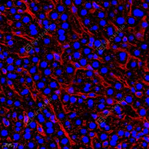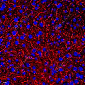 IF检测Apolipoprotein E蛋白(货号 GB112288)(红色). 样品: 小鼠肝, 4%多聚甲醛 (货号G1101) 固定12-24小时. 抗原修复: Tris-EDTA抗原修复液(pH 9.0) (G1203), 98℃, 20分钟. 封闭: 3% BSA(货号GC305010)的PBS溶液, 室温孵育30分钟. —抗: 1: 650稀释, 4℃ 孵育过夜. 二抗: Cy3标记山羊抗兔IgG (H+L) (货号GB21303), 1: 300稀释, 室温孵育1小时. |