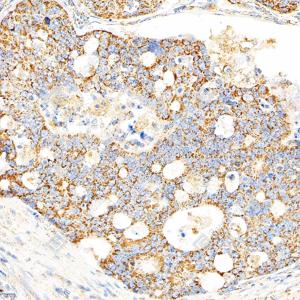IHC检测Apolipoprotein E蛋白(货号 GB115764). 样品: 人结肠癌, 4%多聚甲醛 (货号G1101) 固定12-24小时. 抗原修复: 柠檬酸抗原修复液(干粉, pH 6.0) (G1201), 98℃, 20分钟. —抗: 1: 700稀释, 4℃ 孵育过夜. 二抗: S-vision免疫组化多聚二抗(山羊抗兔),即用型 (货号G1302), 室温孵育20分钟. |