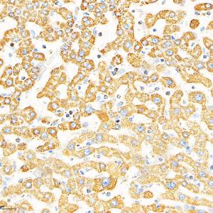 IHC检测Apolipoprotein E蛋白(货号 GB115764). 样品: 人肝, 4%多聚甲醛 (货号G1101) 固定12-24小时. 抗原修复: 柠檬酸抗原修复液(干粉, pH 6.0) (G1201), 98℃, 20分钟. —抗: 1: 700稀释, 4℃ 孵育过夜. 二抗: S-vision免疫组化多聚二抗(山羊抗兔),即用型 (货号G1302), 室温孵育20分钟. |