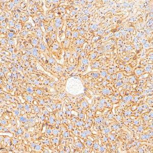 IHC检测Apolipoprotein E蛋白(货号 GB115764). 样品: 小鼠肝, 4%多聚甲醛 (货号G1101) 固定12-24小时. 抗原修复: 柠檬酸抗原修复液(干粉, pH 6.0) (G1201), 98℃, 20分钟. —抗: 1: 700稀释, 4℃ 孵育过夜. 二抗: S-vision免疫组化多聚二抗(山羊抗兔),即用型 (货号G1302), 室温孵育20分钟. |
