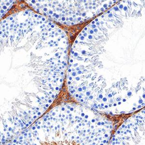 IHC检测Apolipoprotein E蛋白(货号 GB115764). 样品: 大鼠睾丸, 4%多聚甲醛 (货号G1101) 固定12-24小时. 抗原修复: 柠檬酸抗原修复液(干粉, pH 6.0) (G1201), 98℃, 20分钟. —抗: 1: 700稀释, 4℃ 孵育过夜. 二抗: S-vision免疫组化多聚二抗(山羊抗兔),即用型 (货号G1302), 室温孵育20分钟. |