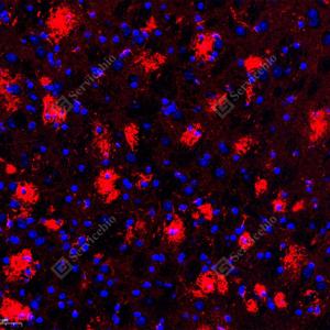 IF检测Apolipoprotein E蛋白(货号 GB115764)(红色). 样品: 小鼠FAD4T转基因小鼠脑组织, 4%多聚甲醛 (货号G1101) 固定12-24小时. 抗原修复: Tris-EDTA抗原修复液(pH 9.0) (货号G1203), 高压锅均匀喷气计时2分钟. 封闭: 3% BSA(货号GC305010)的PBS溶液, 室温孵育30分钟. —抗: 1: 700稀释, 4℃ 孵育过夜. 二抗: Cy3标记山羊抗兔IgG (H+L) (货号GB21303), 1: 300稀释, 室温孵育1小时. |
