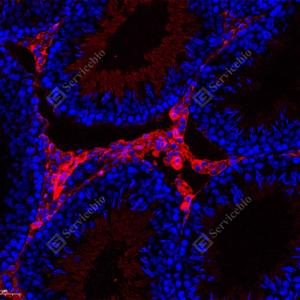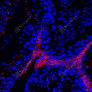 IF检测Apolipoprotein E蛋白(货号 GB115764)(红色). 样品: 大鼠睾丸, 4%多聚甲醛 (货号G1101) 固定12-24小时. 抗原修复: Tris-EDTA抗原修复液(pH 9.0) (货号G1203), 高压锅均匀喷气计时2分钟. 封闭: 3% BSA(货号GC305010)的PBS溶液, 室温孵育30分钟. —抗: 1: 700稀释, 4℃ 孵育过夜. 二抗: Cy3标记山羊抗兔IgG (H+L) (货号GB21303), 1: 300稀释, 室温孵育1小时. |