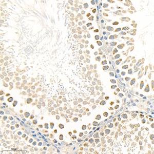 IHC检测Grp75/MOT蛋白(货号 GB11852). 样品: 大鼠睾丸, 4%多聚甲醛 (货号G1101) 固定12-24小时. 抗原修复: 柠檬酸抗原修复液(干粉, pH 6.0) (G1201), 98℃, 20分钟. —抗: 1: 3000稀释, 4℃ 孵育过夜. 二抗: HRP标记山羊抗兔IgG (H+L) (货号GB23303), 1: 200稀释, 室温孵育1小时. |