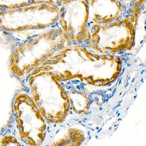 IHC检测Grp75/MOT蛋白(货号 GB11852). 样品: 大鼠肾, 4%多聚甲醛 (货号G1101) 固定12-24小时. 抗原修复: 柠檬酸抗原修复液(干粉, pH 6.0) (G1201), 98℃, 20分钟. —抗: 1: 3000稀释, 4℃ 孵育过夜. 二抗: HRP标记山羊抗兔IgG (H+L) (货号GB23303), 1: 200稀释, 室温孵育1小时. |