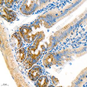 IHC检测Grp75/MOT蛋白(货号 GB11852). 样品: 小鼠空肠, 4%多聚甲醛 (货号G1101) 固定12-24小时. 抗原修复: 柠檬酸抗原修复液(干粉, pH 6.0) (G1201), 98℃, 20分钟. —抗: 1: 3000稀释, 4℃ 孵育过夜. 二抗: HRP标记山羊抗兔IgG (H+L) (货号GB23303), 1: 200稀释, 室温孵育1小时. |