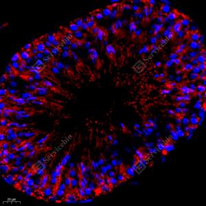 IF检测Grp75/MOT蛋白(货号 GB11852)(红色). 样品: 大鼠睾丸, 4%多聚甲醛 (货号G1101) 固定12-24小时. 抗原修复: Tris-EDTA抗原修复液(pH 9.0) (G1203), 98℃, 20分钟. 封闭: 3% BSA(货号GC305010)的PBS溶液, 室温孵育30分钟. —抗: 1: 1000稀释, 4℃ 孵育过夜. 二抗: Cy3标记山羊抗兔IgG (H+L) (货号GB21303), 1: 300稀释, 室温孵育1小时. |