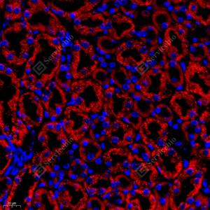 IF检测Grp75/MOT蛋白(货号 GB11852)(红色). 样品: 小鼠肾, 4%多聚甲醛 (货号G1101) 固定12-24小时. 抗原修复: Tris-EDTA抗原修复液(pH 9.0) (G1203), 98℃, 20分钟. 封闭: 3% BSA(货号GC305010)的PBS溶液, 室温孵育30分钟. —抗: 1: 1000稀释, 4℃ 孵育过夜. 二抗: Cy3标记山羊抗兔IgG (H+L) (货号GB21303), 1: 300稀释, 室温孵育1小时. |