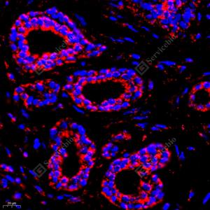 IF检测Grp75/MOT蛋白(货号 GB11852)(红色). 样品: 人乳腺癌, 4%多聚甲醛 (货号G1101) 固定12-24小时. 抗原修复: Tris-EDTA抗原修复液(pH 9.0) (G1203), 98℃, 20分钟. 封闭: 3% BSA(货号GC305010)的PBS溶液, 室温孵育30分钟. —抗: 1: 1000稀释, 4℃ 孵育过夜. 二抗: Cy3标记山羊抗兔IgG (H+L) (货号GB21303), 1: 300稀释, 室温孵育1小时. |