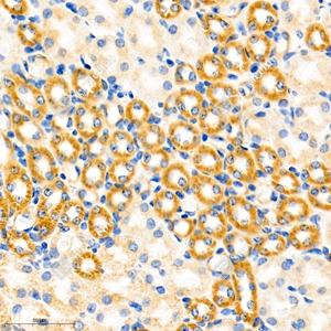 IHC检测GBA蛋白(货号 GB111110). 样品: 小鼠肾, 4%多聚甲醛 (货号G1101) 固定12-24小时. 抗原修复: 柠檬酸抗原修复液(干粉, pH 6.0) (G1201), 98℃, 20分钟. —抗: 1: 1000稀释, 4℃ 孵育过夜. 二抗: HRP标记山羊抗兔IgG (H+L) (货号GB23303), 1: 200稀释, 室温孵育1小时. |