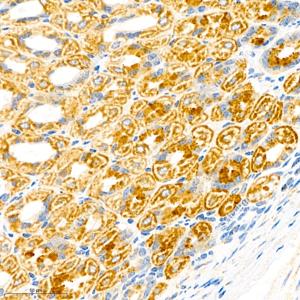 IHC检测GBA蛋白(货号 GB111110). 样品: 大鼠胃, 4%多聚甲醛 (货号G1101) 固定12-24小时. 抗原修复: 柠檬酸抗原修复液(干粉, pH 6.0) (G1201), 98℃, 20分钟. —抗: 1: 1000稀释, 4℃ 孵育过夜. 二抗: HRP标记山羊抗兔IgG (H+L) (货号GB23303), 1: 200稀释, 室温孵育1小时. |