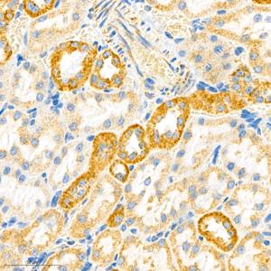 IHC检测GBA蛋白(货号 GB111110). 样品: 大鼠肾, 4%多聚甲醛 (货号G1101) 固定12-24小时. 抗原修复: 柠檬酸抗原修复液(干粉, pH 6.0) (G1201), 98℃, 20分钟. —抗: 1: 1000稀释, 4℃ 孵育过夜. 二抗: HRP标记山羊抗兔IgG (H+L) (货号GB23303), 1: 200稀释, 室温孵育1小时. |