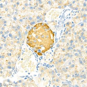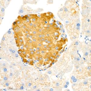 IHC检测GBA蛋白(货号 GB111110). 样品: 大鼠胰腺炎, 4%多聚甲醛 (货号G1101) 固定12-24小时. 抗原修复: 柠檬酸抗原修复液(干粉, pH 6.0) (G1201), 98℃, 20分钟. —抗: 1: 2000稀释, 4℃ 孵育过夜. 二抗: HRP标记山羊抗兔IgG (H+L) (货号GB23303), 1: 200稀释, 室温孵育1小时. |
