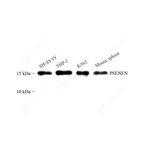 WB检测PEN2蛋白(货号 GB114872). 样品: 经RIPA裂解液(货号G2002)处理的蛋白质. 封闭: 封闭: 3%脱脂牛奶(货号GC310001)溶于TBST溶液, 室温孵育1小时. —抗: 1: 1000稀释, 4℃ 孵育过夜. 二抗: HRP标记山羊抗兔IgG (H+L) (货号GB23303), 1: 5000稀释, 室温孵育1小时. |