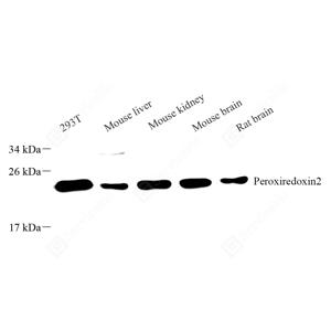| WB检测Peroxiredoxin 2/PRP蛋白(货号 GB121254). 样品: 经RIPA裂解液(货号G2002)处理的蛋白质. 封闭: 封闭: 3%脱脂牛奶(货号GC310001)溶于TBST溶液, 室温孵育1小时. —抗: 1: 1000稀释, 4℃ 孵育过夜. 二抗: HRP标记山羊抗小鼠IgG (H+L) (货号GB23301), 1: 5000稀释, 室温孵育1小时. |