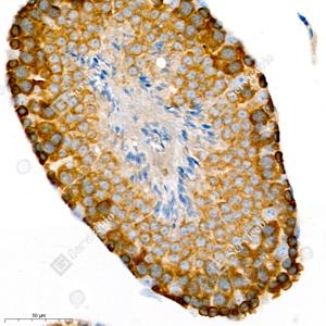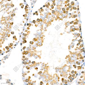 IHC检测Seladin 1蛋白(货号 GB111301). 样品: 小鼠睾丸, 4%多聚甲醛 (货号G1101) 固定12-24小时. 抗原修复: 柠檬酸抗原修复液(干粉, pH 6.0) (G1201), 98℃, 20分钟. —抗: 1: 1000稀释, 4℃ 孵育过夜. 二抗: HRP标记山羊抗兔IgG (H+L) (货号GB23303), 1: 200稀释, 室温孵育1小时. |