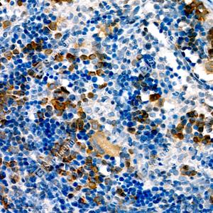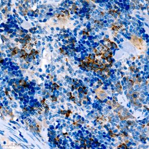 IHC检测Seladin 1蛋白(货号 GB111301). 样品: 小鼠脾, 4%多聚甲醛 (货号G1101) 固定12-24小时. 抗原修复: 柠檬酸抗原修复液(干粉, pH 6.0) (G1201), 98℃, 20分钟. —抗: 1: 1000稀释, 4℃ 孵育过夜. 二抗: HRP标记山羊抗兔IgG (H+L) (货号GB23303), 1: 200稀释, 室温孵育1小时. |