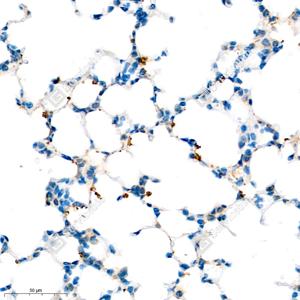 IHC检测Seladin 1蛋白(货号 GB111301). 样品: 大鼠肺, 4%多聚甲醛 (货号G1101) 固定12-24小时. 抗原修复: 柠檬酸抗原修复液(干粉, pH 6.0) (G1201), 98℃, 20分钟. —抗: 1: 1000稀释, 4℃ 孵育过夜. 二抗: HRP标记山羊抗兔IgG (H+L) (货号GB23303), 1: 200稀释, 室温孵育1小时. |