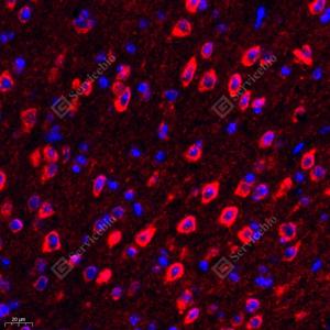 IF检测Seladin 1蛋白(货号 GB111301)(红色). 样品: 小鼠脑, 4%多聚甲醛 (货号G1101) 固定12-24小时. 抗原修复: Tris-EDTA抗原修复液(pH 9.0) (G1203), 98℃, 20分钟. 封闭: 3% BSA(货号GC305010)的PBS溶液, 室温孵育30分钟. —抗: 1: 1000稀释, 4℃ 孵育过夜. 二抗: Cy3标记山羊抗兔IgG (H+L) (货号GB21303), 1: 300稀释, 室温孵育1小时. |