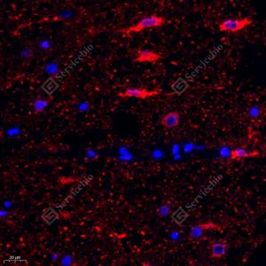 IF检测Seladin 1蛋白(货号 GB111301)(红色). 样品: 大鼠脊髓, 4%多聚甲醛 (货号G1101) 固定12-24小时. 抗原修复: Tris-EDTA抗原修复液(pH 9.0) (G1203), 98℃, 20分钟. 封闭: 3% BSA(货号GC305010)的PBS溶液, 室温孵育30分钟. —抗: 1: 1000稀释, 4℃ 孵育过夜. 二抗: Cy3标记山羊抗兔IgG (H+L) (货号GB21303), 1: 300稀释, 室温孵育1小时. |