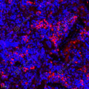 IF检测Seladin 1蛋白(货号 GB111301)(红色). 样品: 大鼠脾, 4%多聚甲醛 (货号G1101) 固定12-24小时. 抗原修复: Tris-EDTA抗原修复液(pH 9.0) (G1203), 98℃, 20分钟. 封闭: 3% BSA(货号GC305010)的PBS溶液, 室温孵育30分钟. —抗: 1: 1000稀释, 4℃ 孵育过夜. 二抗: Cy3标记山羊抗兔IgG (H+L) (货号GB21303), 1: 300稀释, 室温孵育1小时. |